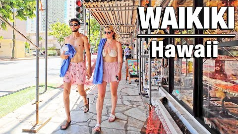 Walking Tour in Waikiki along Kuhio Avenue with a detour through the International Market Place watching many tourists and travelers exploring the shops, restaurants and hotels in this beautiful resort city in Hawaii.