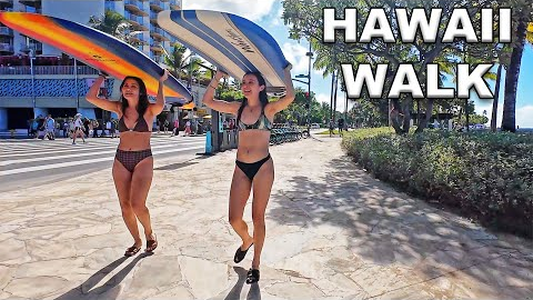 November 23, 2025 Walking Tour in Waikiki along Kalakaua and Kuhio Avenue with a detour through the Hyatt Regency Waikiki Beach Hotel, watching many tourists and travelers exploring the shops, restaurants and hotels in this beautiful resort city in Hawaii.
